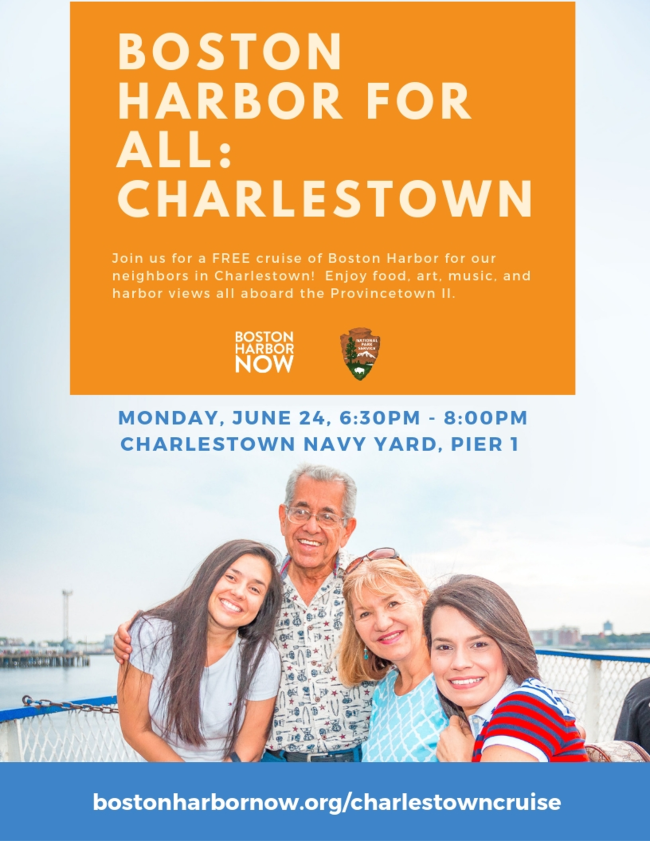 Boston Harbor Now, along with Bay State Cruise Company and in partnership with National Park Service welcomes all members of the Charlestown community on the Provincetown II for an evening of FREE food, art, music, Harbor views, entertainment and enjoyment with friends and family. Our flyer is attached for your reference.